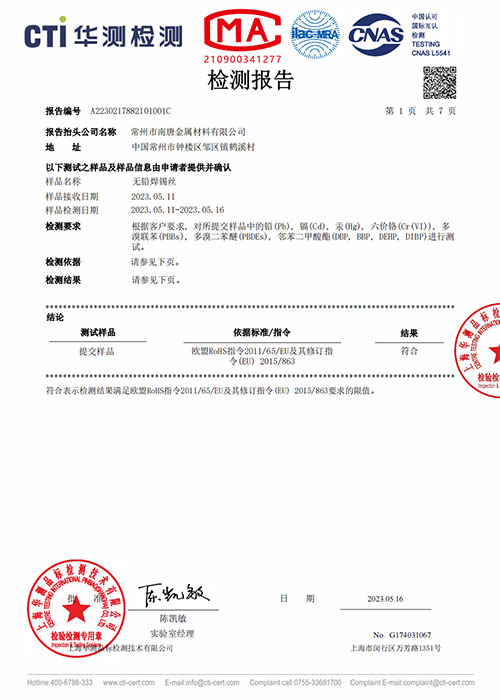 无铅焊锡条检测报告